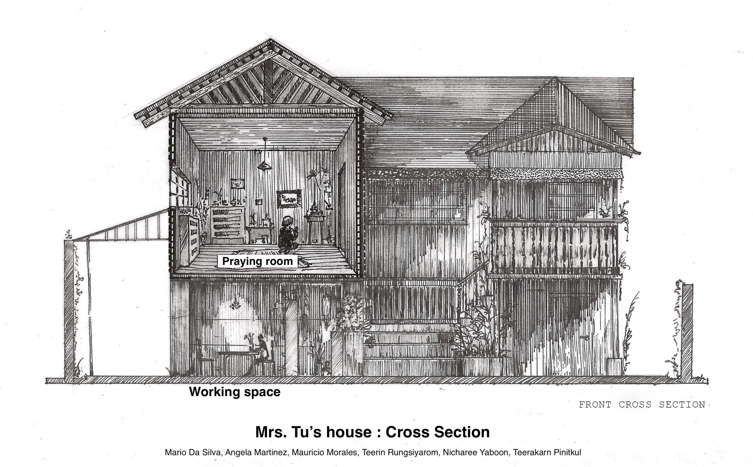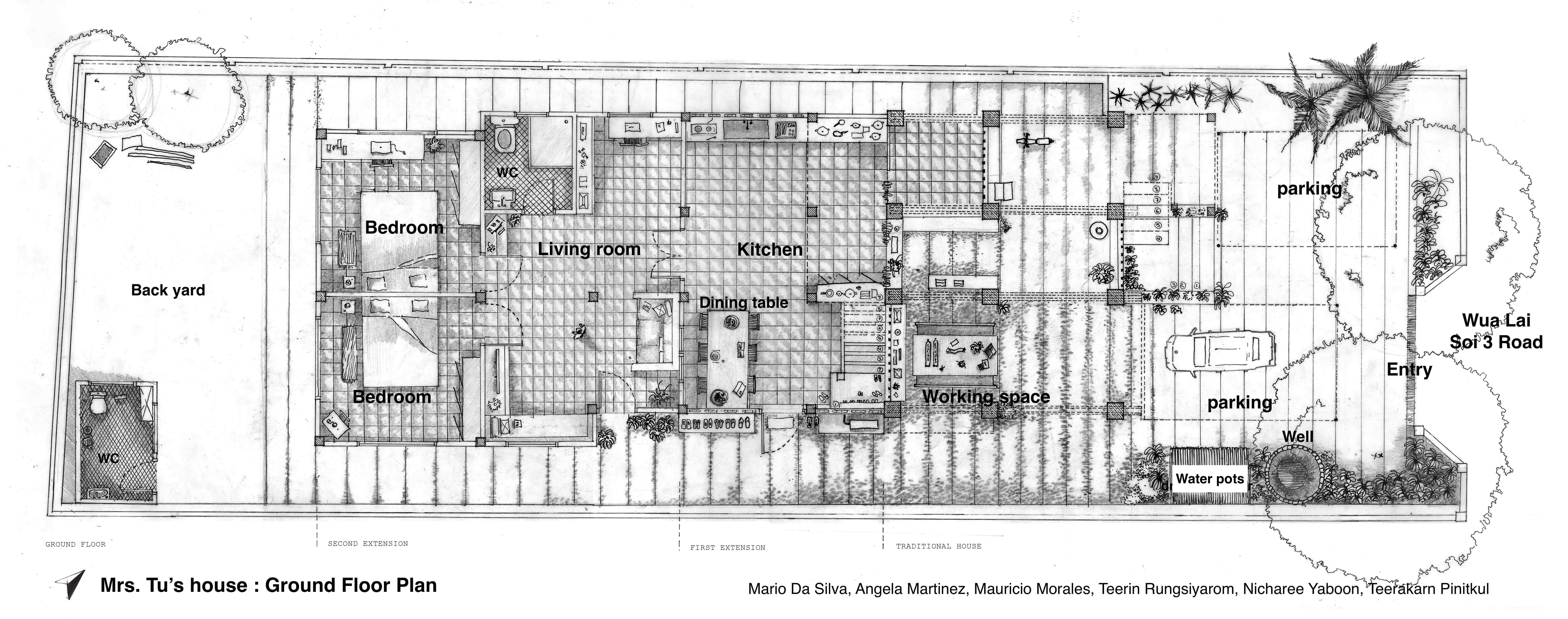 The drawings also show the relation between the house, the garden, and the key elements of Lanna’s house such as ancestor altar, guardian spirits altar, well and stand of drinking water pots called han nam. Like many residents in Ban Wua Lai, Mrs. Tu still keeps and maintains the old well and the stand of water pots situated in her front yard. Han nam represents the sharing spirit and culture of Lanna people ; in the past, it was placed in front of each house for providing drinking water for the guests and the travellers. Nowaday, han nam is a sign of welcome which is integrated in the cultural landscape and urban culture of Northern Thai cities.