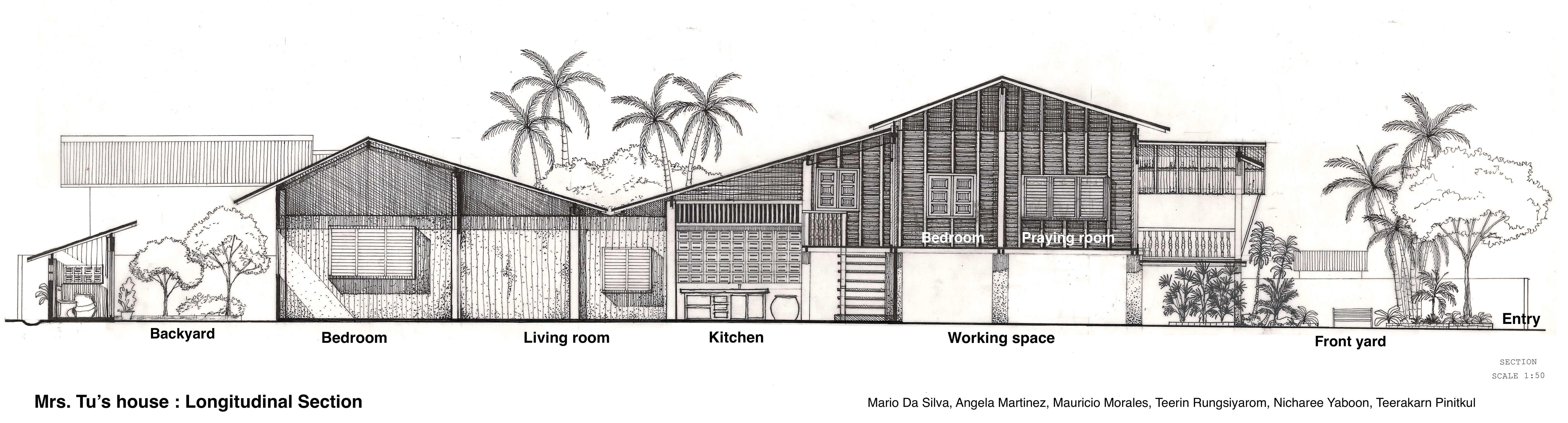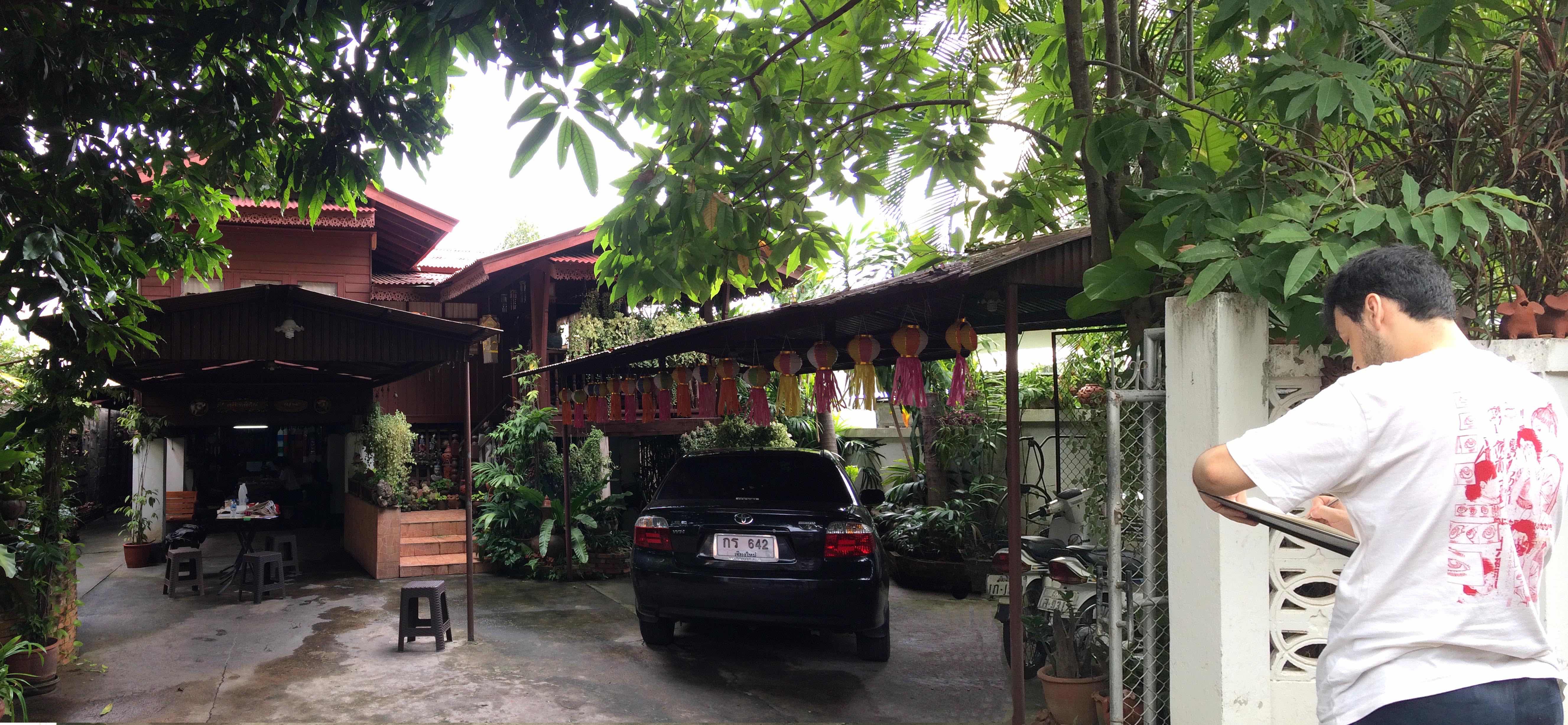 Not far from Mrs. Tu’s work table, another student was sketching the house’s facade and taking note of the use of domestic space. The drawing exercise enable students to learn how to observe and understand the “place”. This approach provides a form of analysis and presentation that illustrates the way how the residents shape the built environment of neighbourhood. Ban Wua Lai exhibits the traditional urban settlement form of Chiang Mai: organic form of alleyway with the tiny lots and small footprint buildings. Each compound has an open space between the alleyway and the house which usually contain the well and feature one or more shade-giving trees. This traditional urban forms have promoted social cohesion, walking, local economic interactions, and an evolved response to climate.