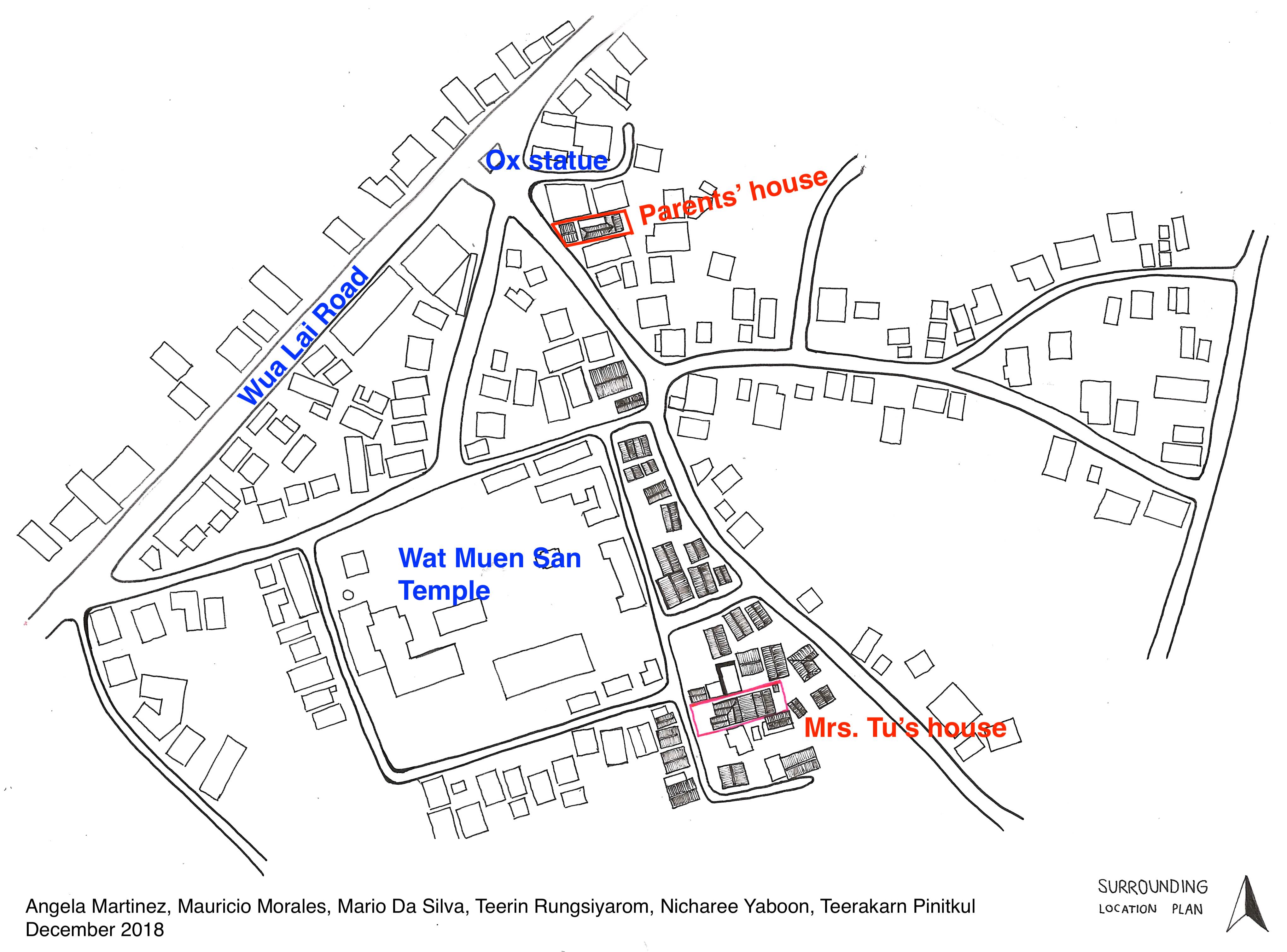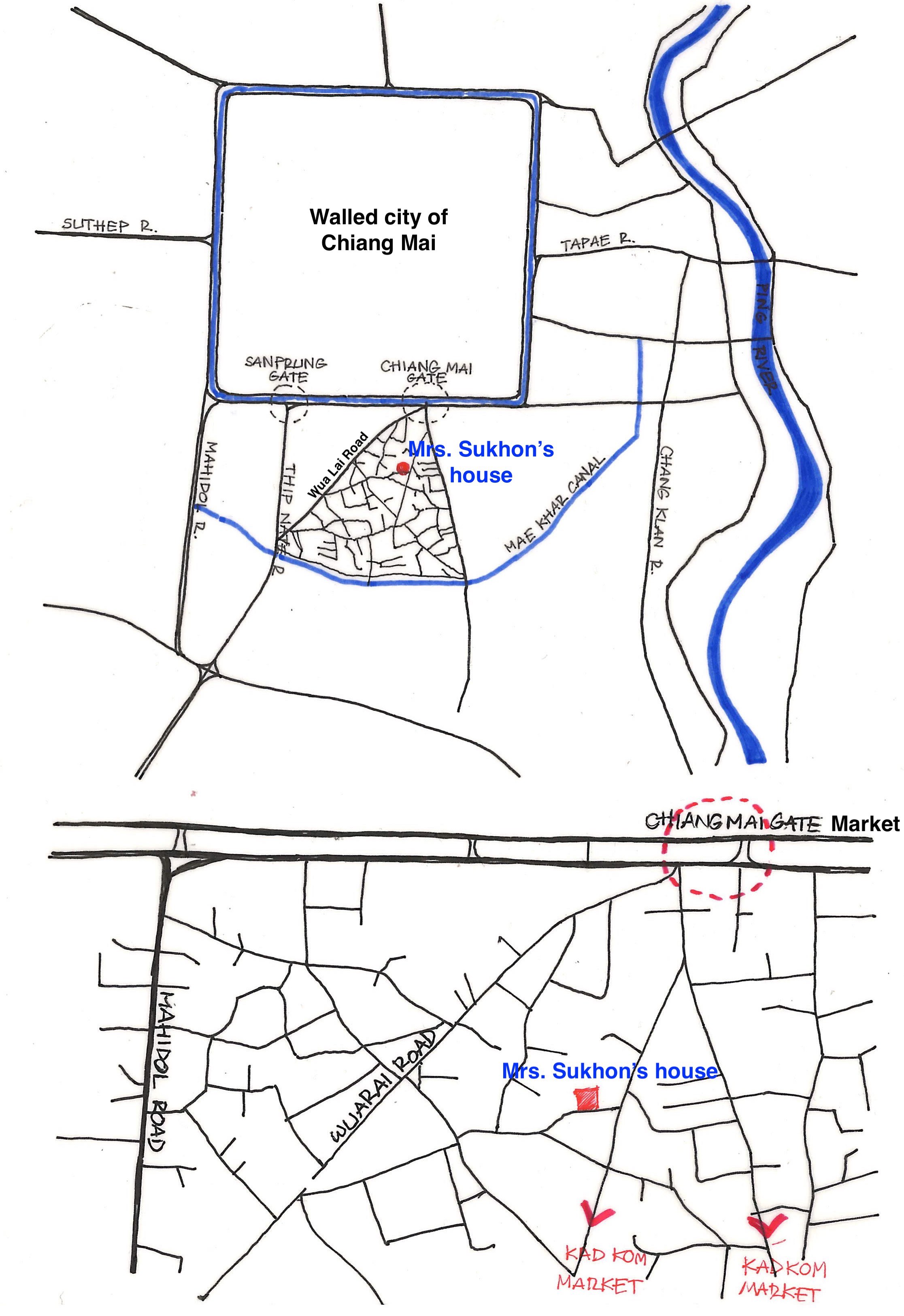The plan of location shows that Mrs. Sukhon’s house is located midway between Kad Kom (local market of Ban Wua Lai) and Kad Pratu Chiang Mai (city’s market).