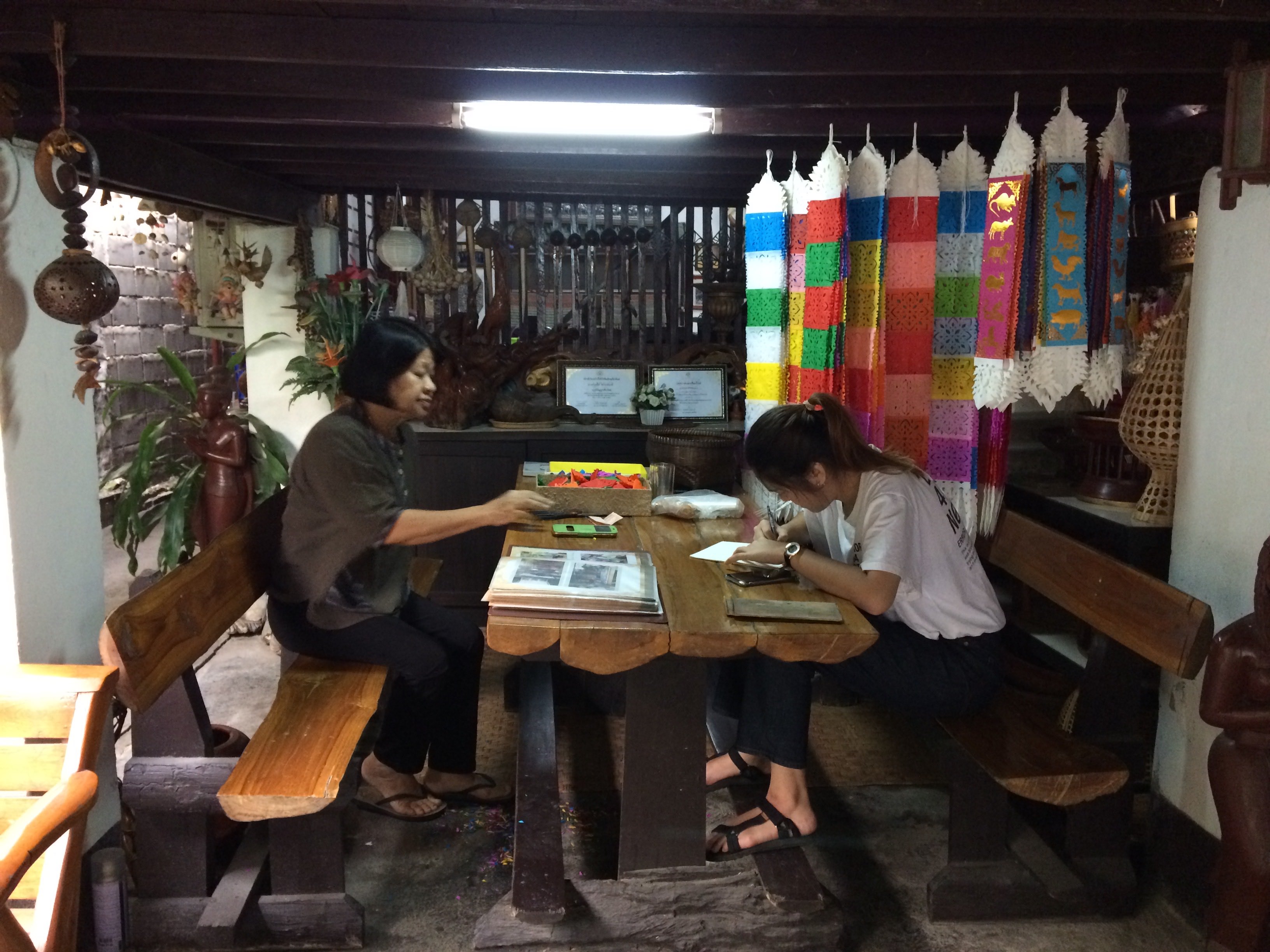 Sitting on a wooden table, one of our students started to talk with Mrs. Tu (Saisunee Chaiwongyart), a retired nurse and house owner, about her daily life and family background. The lady patiently answered the student’s questions while continuing to make the colorful Lanna flag (tung). The interview revealed that her family has been settled in Wua Lai neighbourhood for three generations. Her parents’ house was situated next to the ox statue, near by the entrance of Muen San Temple. After she gave birth to her second child almost thirty years ago, Mrs. Tu and her husband decided to move to a house nearby, located near another entrance of Muen San Temple. Mrs. Tu underlined that she has preferred to stay in her native neighbourhood where her relatives live.