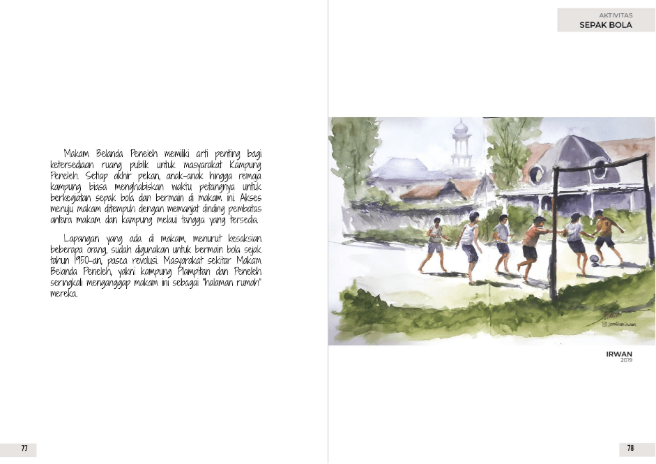 The book consists of five chapters, namely 1) lingkungan (environment), 2) bangunan (buildings), 3) aktivitas (activities), 4) makanan (food), and 5) makam (tombs). The chapters are based on SEANNET research findings, which had documented meaningful spaces and activities in the neighborhood. Each sketch is accompanied with narratives to shed light on the importance of the spaces and activities that the sketcher had drawn.