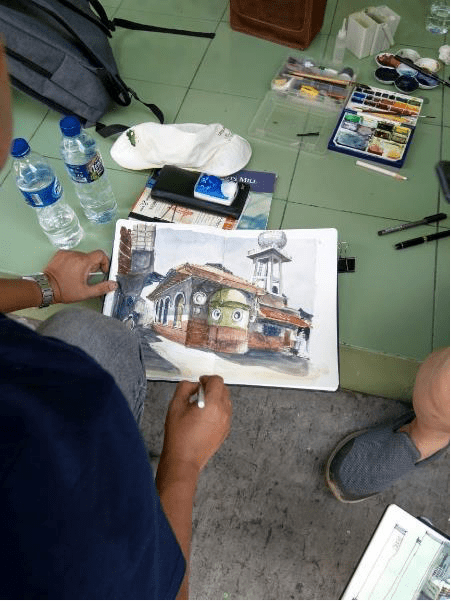 The sketchbook production process itself was a learning journey for all who were involved. The small public sketching activities culminated in an Urban Sketchers Surabaya event on 5 May 2019, which brought more than 30 urban sketchers to Peneleh. The urban sketchers observed and interacted with community members and the spaces. Starting with sketching the Dutch cemetery in the morning, during the day the sketchers spread to various alleyways of Kampung Peneleh, guided by SEANNET team members to facilitate interaction with community members. The event culminated in a neighborhood gathering, with a complete lunch that featured Peneleh culinary traditions.