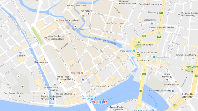 manilla3 Previous Published March 18, 2018 at 806 × 455 in Escolta Santa Cruz district, Manila (Philippines) Map of Escolta Santa Cruz neighborhood, centered around the Sta. Cruz Church (source: Google Maps)